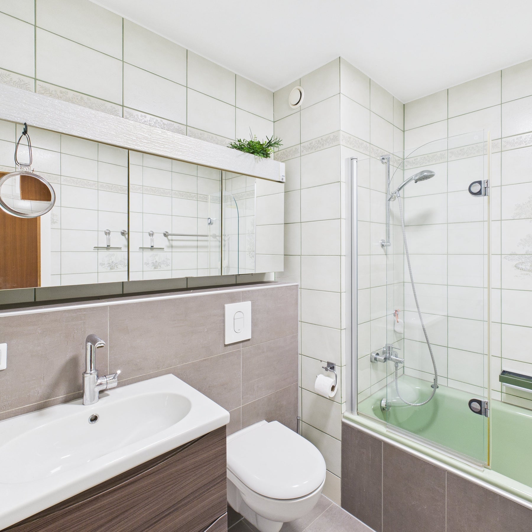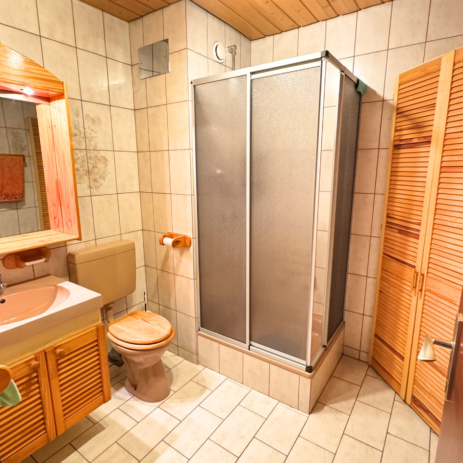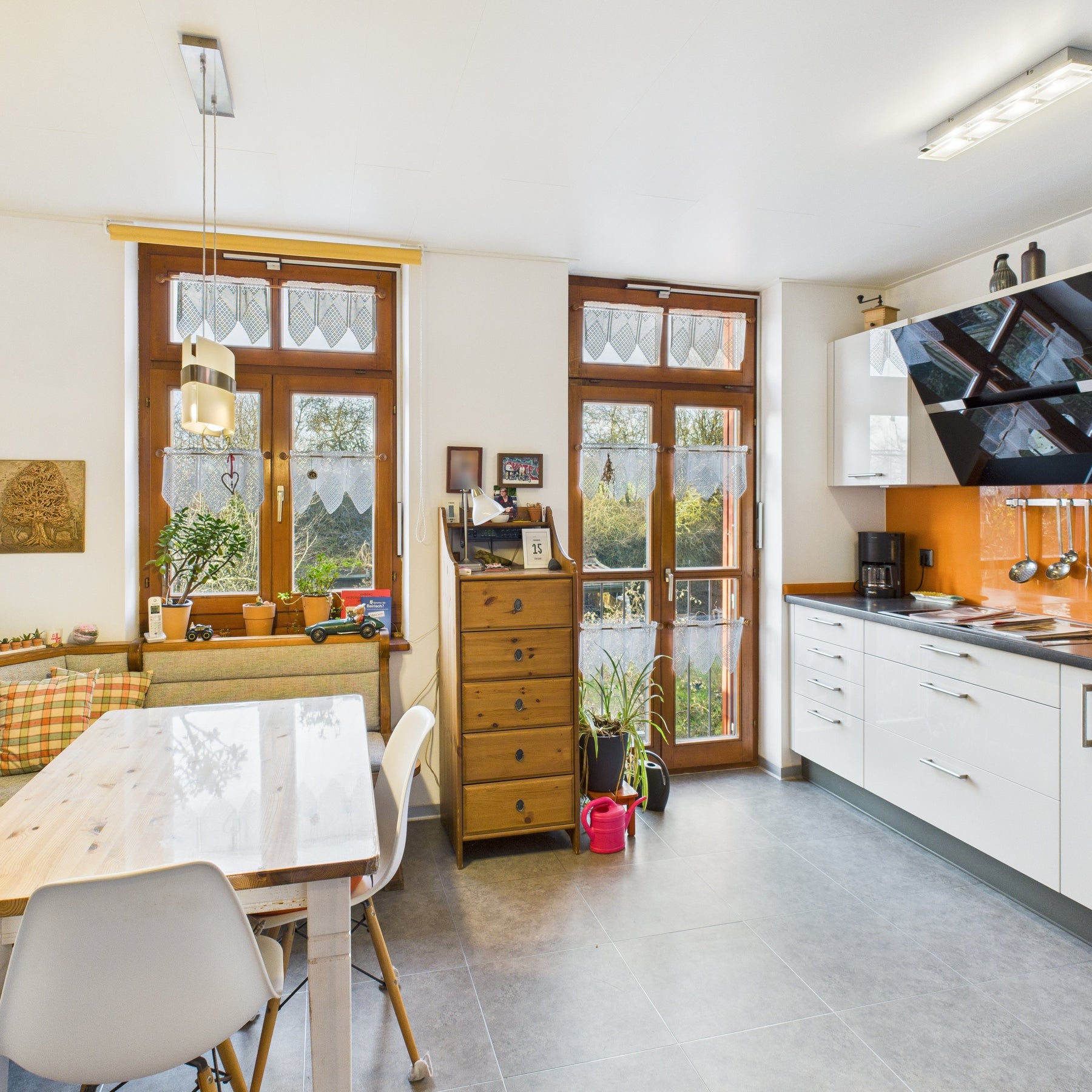 Die Küche wurde 2014 erneuert und verfügt über eine praktische, optisch zurückhaltende Nische, die Platz für den Kühlschrank sowie weitere Küchengeräte oder Vorräte bietet. Zwei Bäder - ein Duschbad (Kinderbad) sowie ein Bad mit Badewanne (Elternbad)- sorgen für Komfort im Alltag. Im Erdgeschoss befindet sich zudem eine separate Gäste-Toilette. Das Elternbad wurde 2016 modernisiert.