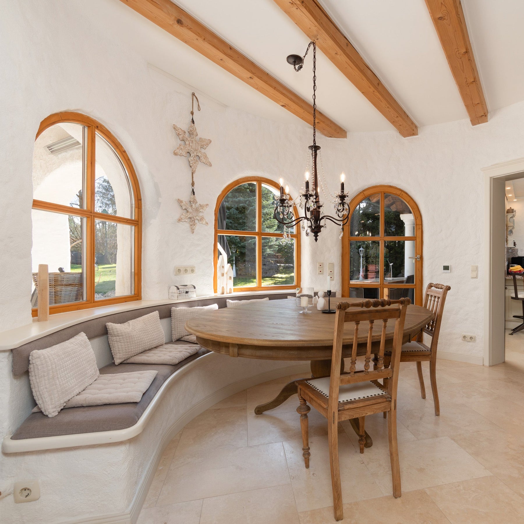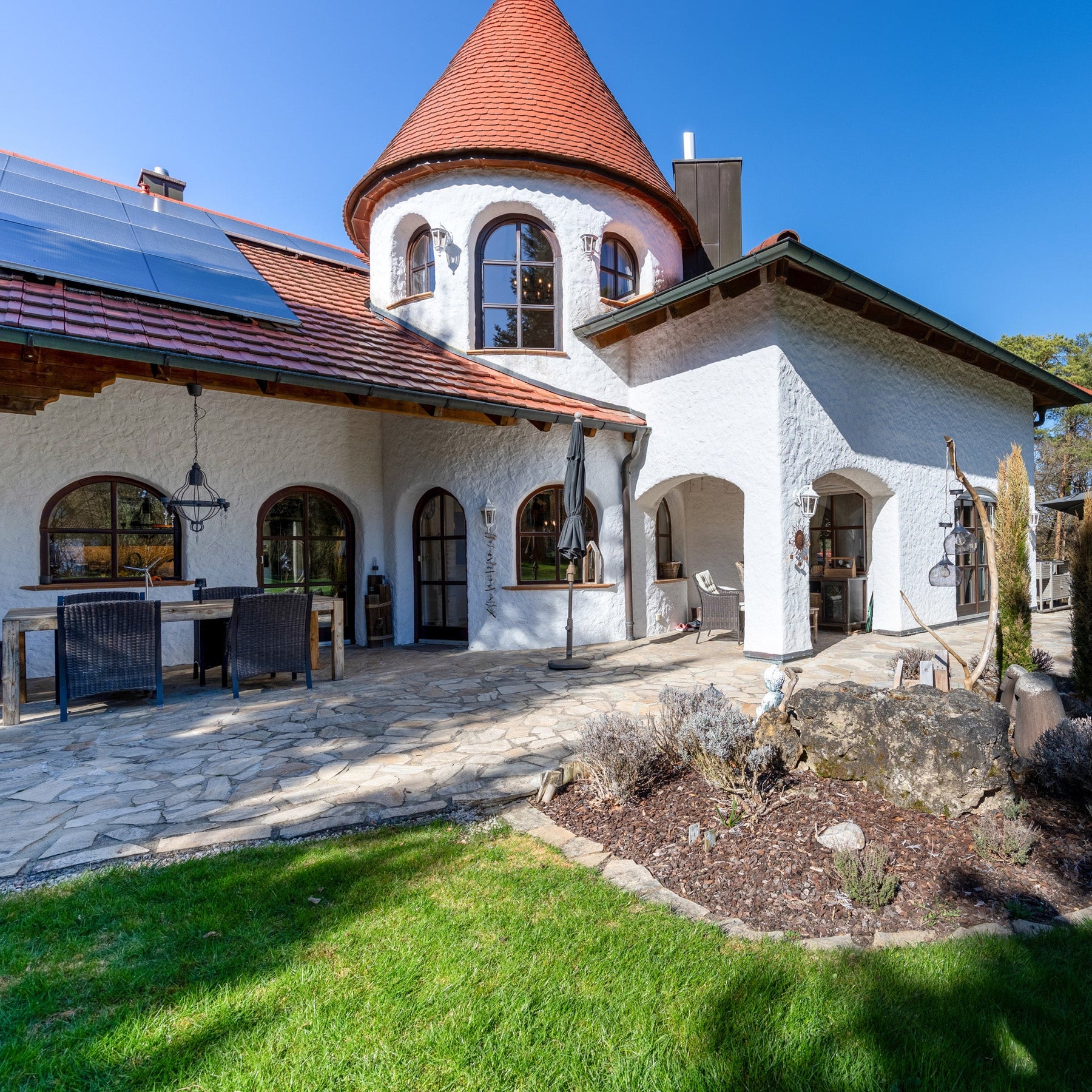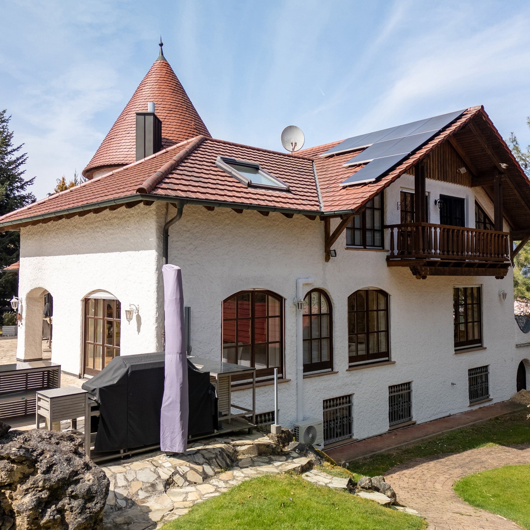 Vom Erdgeschoss aus gelangt man sowohl auf den praktischen Balkon am Esszimmer, als auch auf die großzügige Terrasse mit überdachtem Freisitz und dem Außengrillplatz. Ideal für stilvolle Sommerabende mit Freunden oder ein ausgedehntes Outdoor-Familienfrühstück.