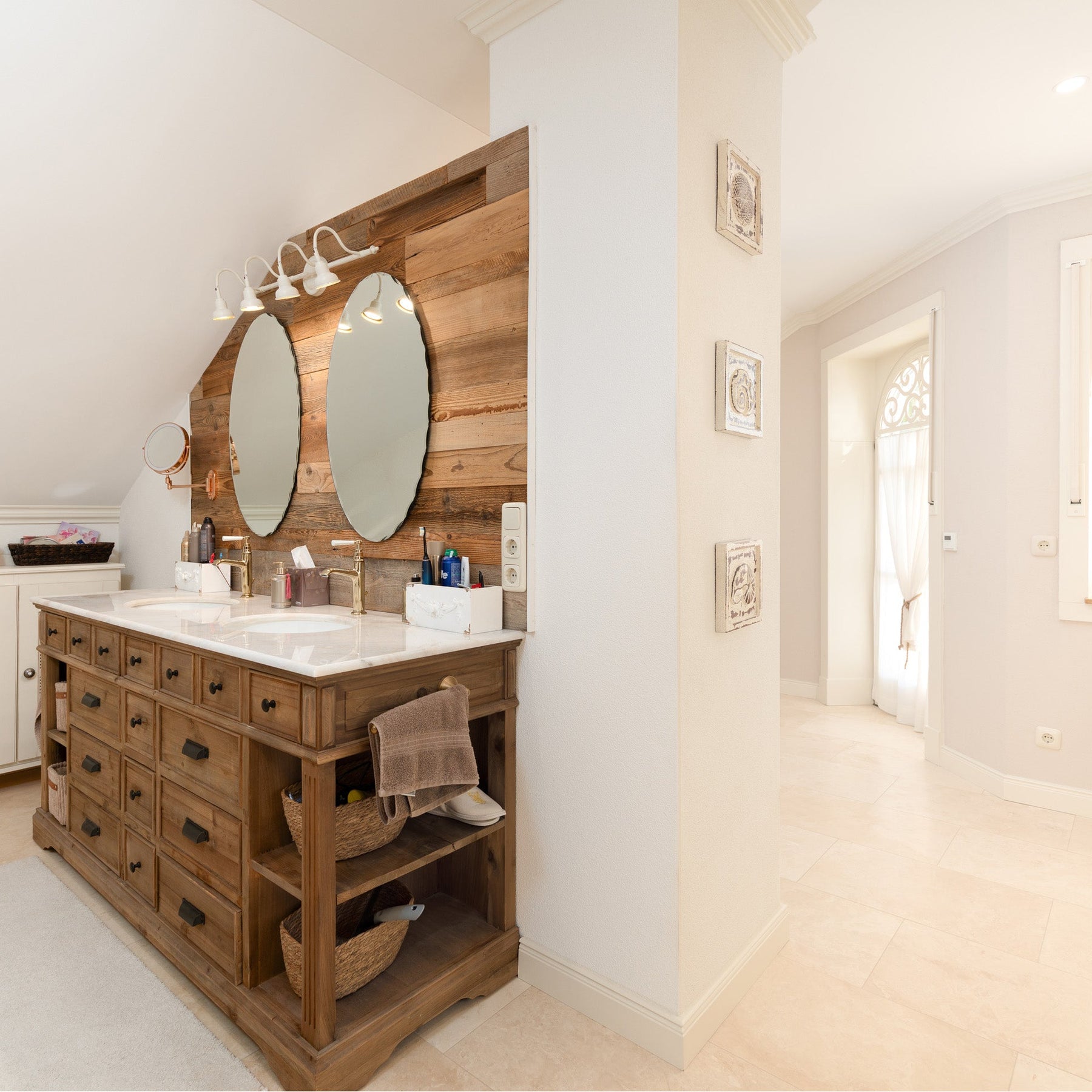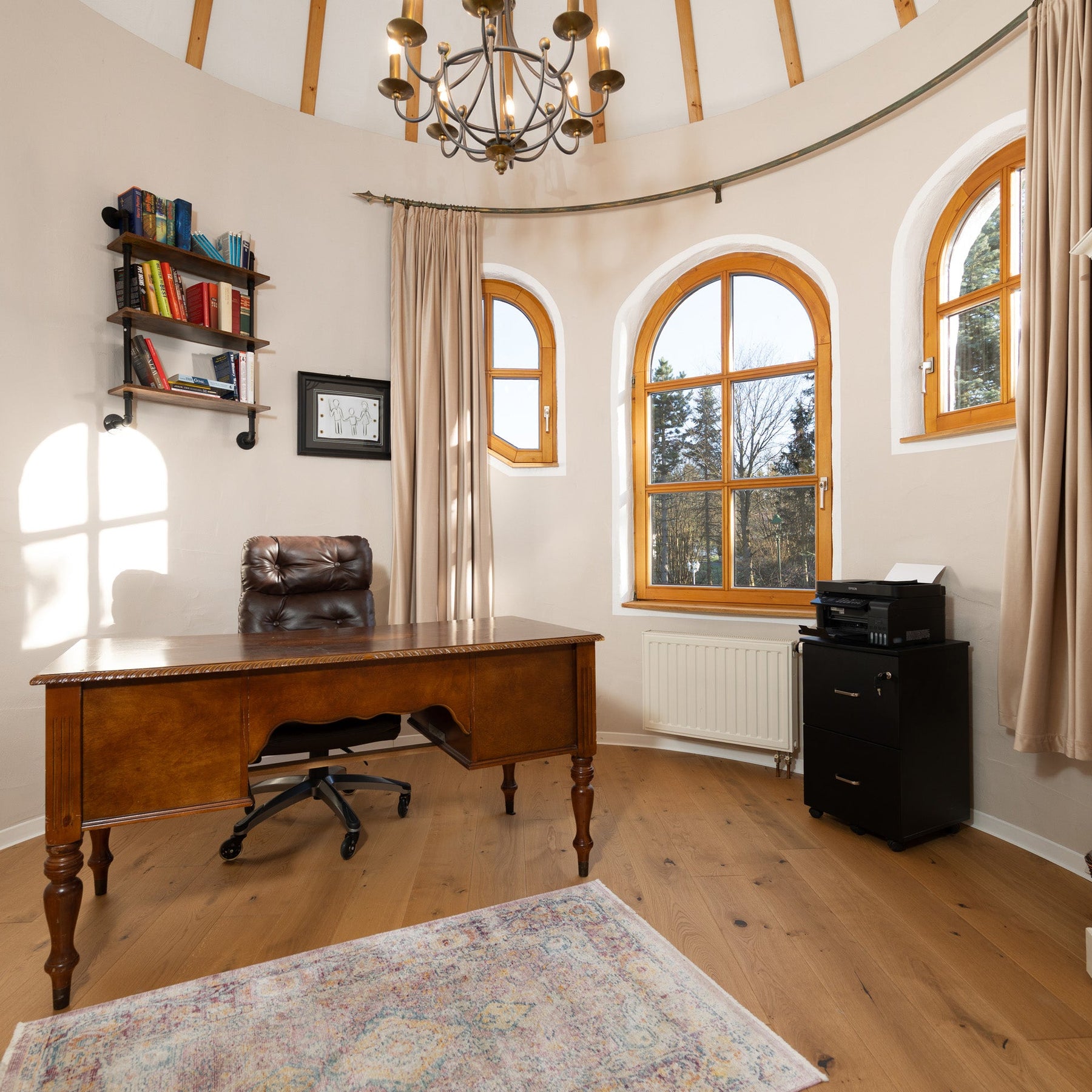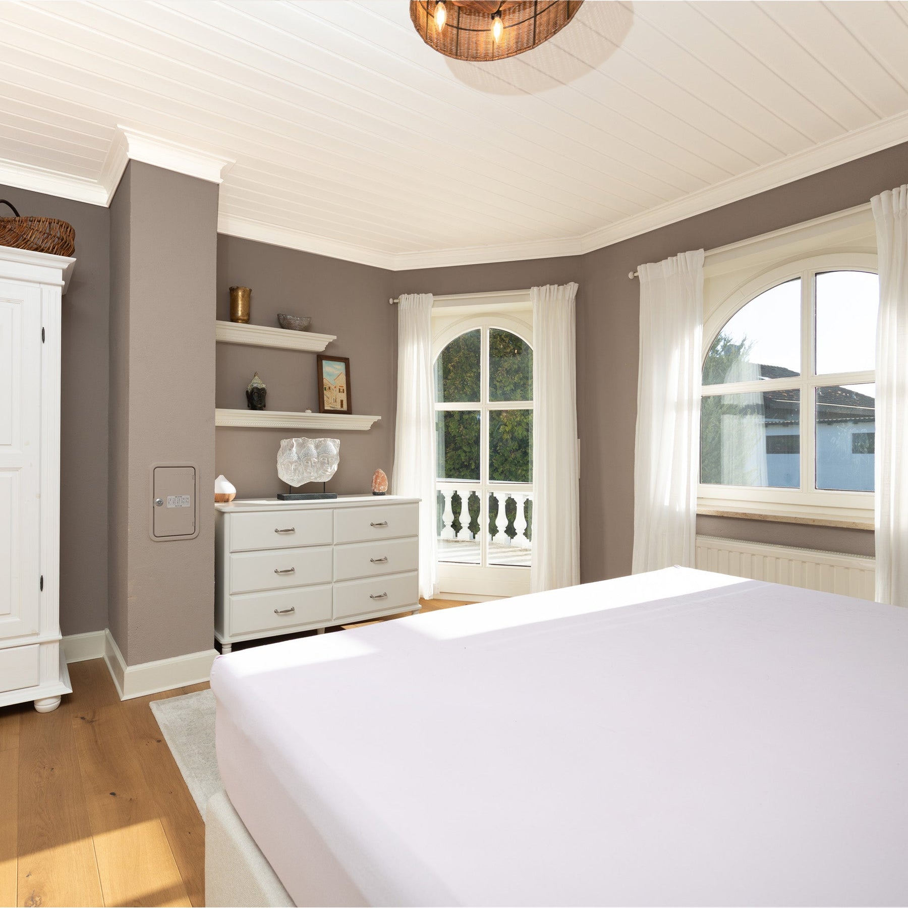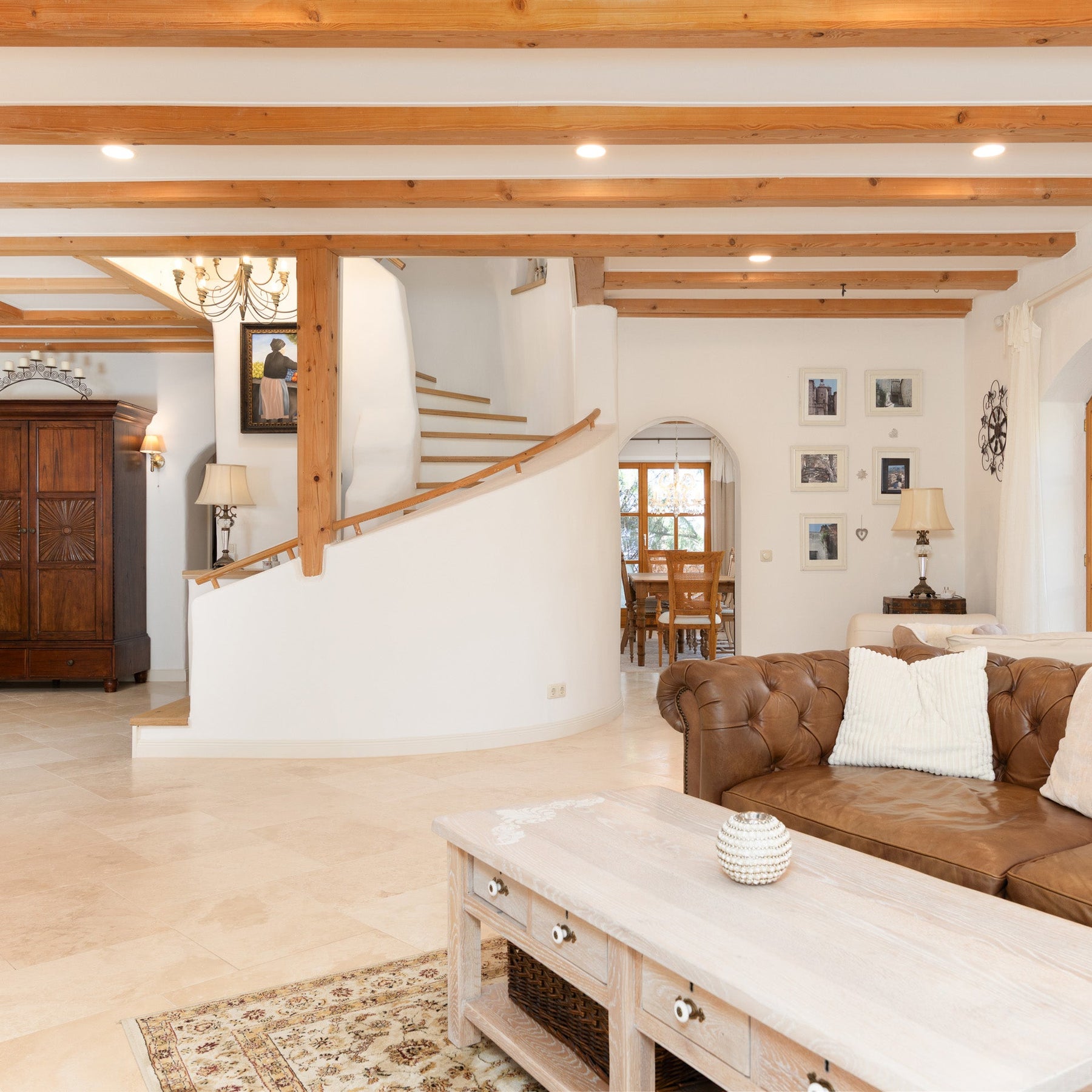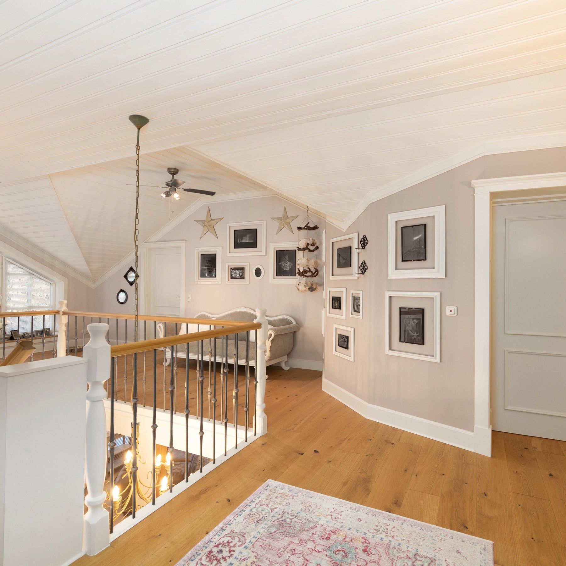 Die zentral gelegene Galerietreppe ins Obergeschoss dieses Hauses führt zu den 3 Schlafzimmern, dem Masterbad, einer Ankleide und dem "Turmzimmer", welches eine beeindruckende Raumhöhe bietet und ideal als Arbeits- oder zusätzliches Gästezimmer nutzbar ist. Balkone an der Vorder- und Hinterseite bieten weiteren Raum in warmen Sommermonaten.