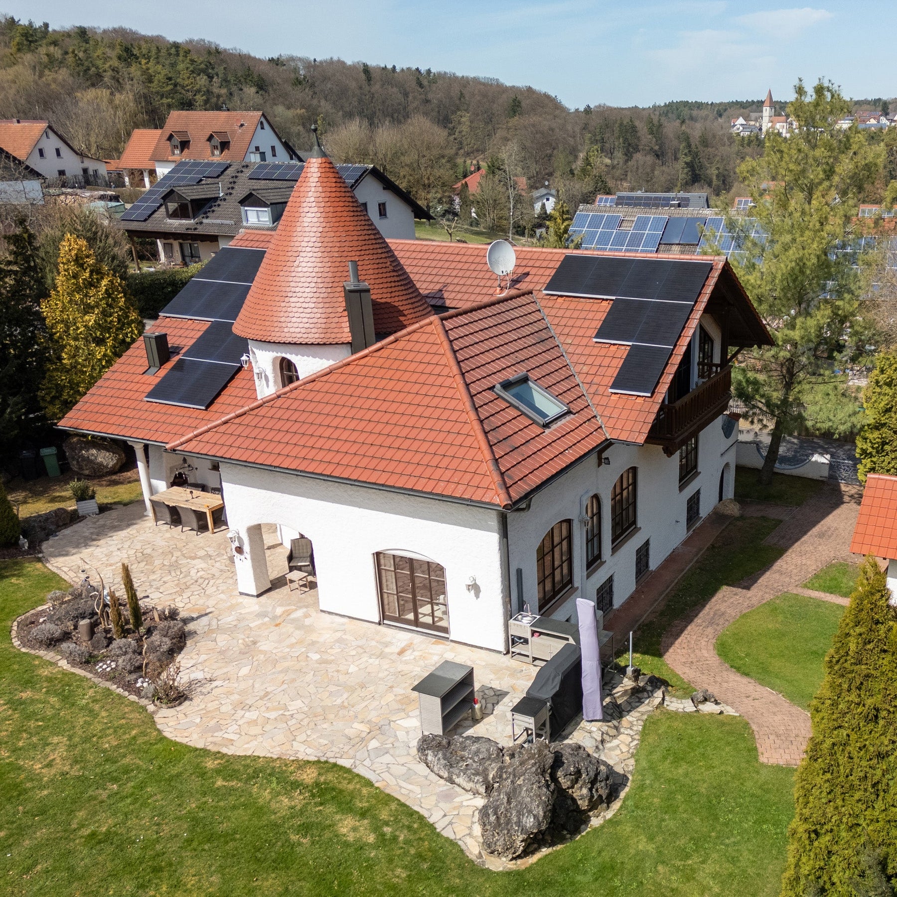 Technisch wurde das Haus ebenfalls überarbeitet - Die Wärmeversorgung erfolgt über eine zuverlässige Zentralheizung mit Ölbrenner aus dem Jahr 1998 und eine Fußbodenheizung mit aufwendiger Steuerung für sehr niedrige Verbrauchswerte. Eine 10kW Photovoltaikanlage mit ebenfalls 10 kW Speicherbatterie reduziert zudem die Stromkosten effektiv und zeitgemäß.